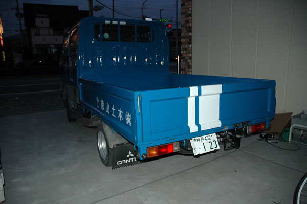 トラックへのロゴ貼り付けを行いました。 屋根にストライプを貼ったのですが、コルゲート(強度を出すための凹凸)があり、時間を頂戴しました。