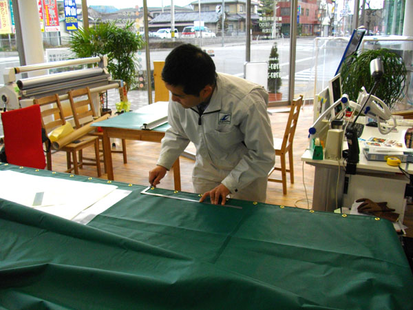 テントの文字入れは粘着性の良いテント用カッティングシートを使用します。縫い目から測って正確な位置に文字を貼っていきます。