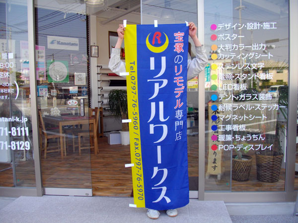 お世話になっている宝塚南口のリアルワークスさんからのご依頼でのぼりを作りました。鮮やかな発色で仕上がりました。 |