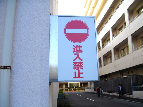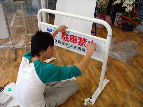 兵庫医大様の立体駐車場入口部分の出入方法が変更になり、進入禁止の看板を貼りました。 |