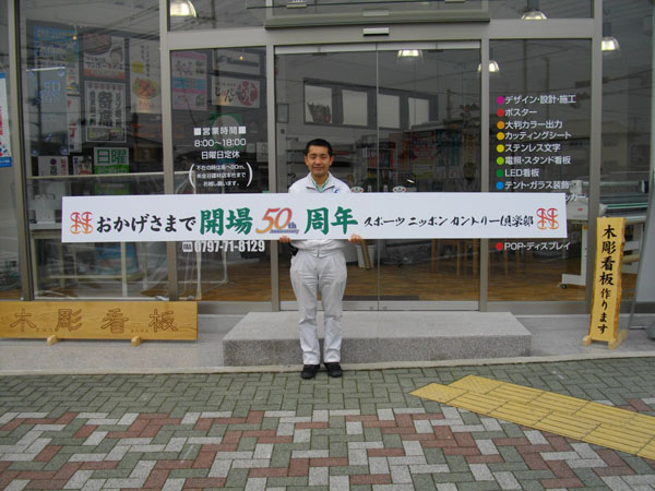 室内会場を飾る横断幕形の看板です。50周年おめでとうございます。 |