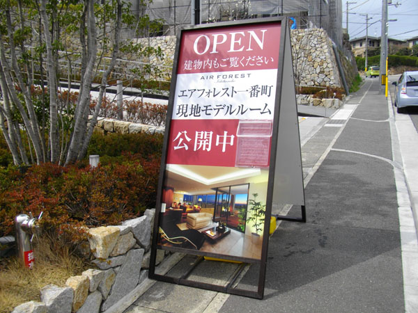176号線の宝塚石油さま脇に作らせていただいた看板です。壁を傷めないように引っ掛け式にしています。 |
