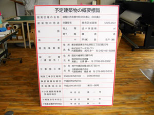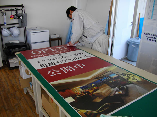 建設予定地の仮説事務所に掲げる看板です。終了後、別の現場でも使えるように、1800幅で分割可能なように設計しました。 |