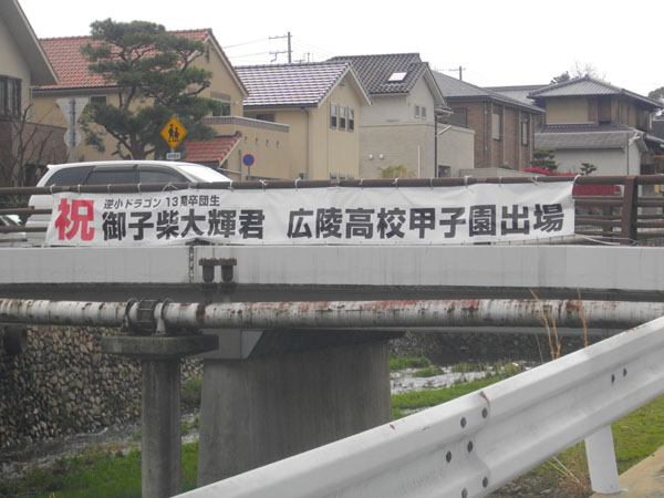以前作らせていただいた横断幕が使われているので写真を撮りました。場所は阪急逆瀬川駅西です。甲子園出場、おめでとうございます。