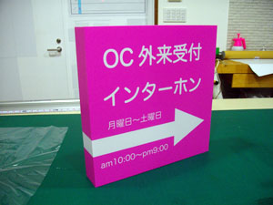 OC外来の特注看板です。アクリルの箱に電飾用の塩ビ印刷を貼り付けました。
