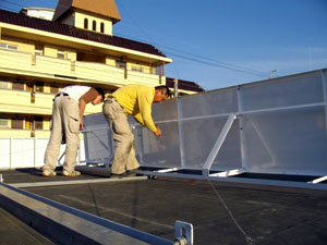 | コンテナハウス上での取り付け作業。ビスナットで接合すれば、一体化します。 |