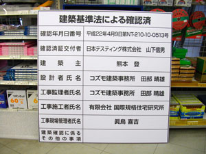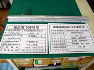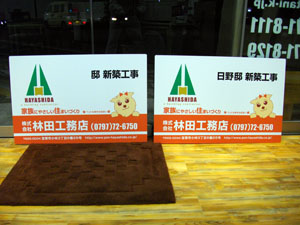 ○○邸新築工事の看板です。○○の部分はカッティングシートで文字を入れて貼り替えがきくようになっています。 |