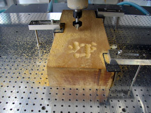 弊社の彫刻マシンで彫刻をしている写真です。刃を交換することで、様々な形状に彫る事が可能です。 |